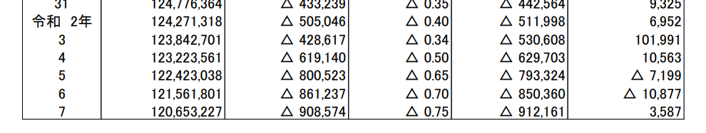 こちらの資料を見ると、どれくらいの人口が毎年減少しているかを把握することができる。
